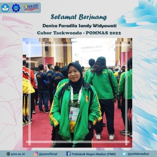 Madiun - Atlet Taekwondo Politeknik Negeri Madiun (PNM) menjadi salah satu wakil Provinsi Jawa Timur pada Pekan Olahraga Mahasiswa Nasional XVII tahun 2022 (POMNAS 2022) di Padang, Sumatera Barat. Atlet tersebut yakni Danisa Faradila Sandy Widyawati, mahasiswa Program Studi Akuntansi yang juga menjadi peraih medali emas cabang olahraga (cabor) Taekwondo di ajang POMPROV Jatim 2022 pada Maret lalu.