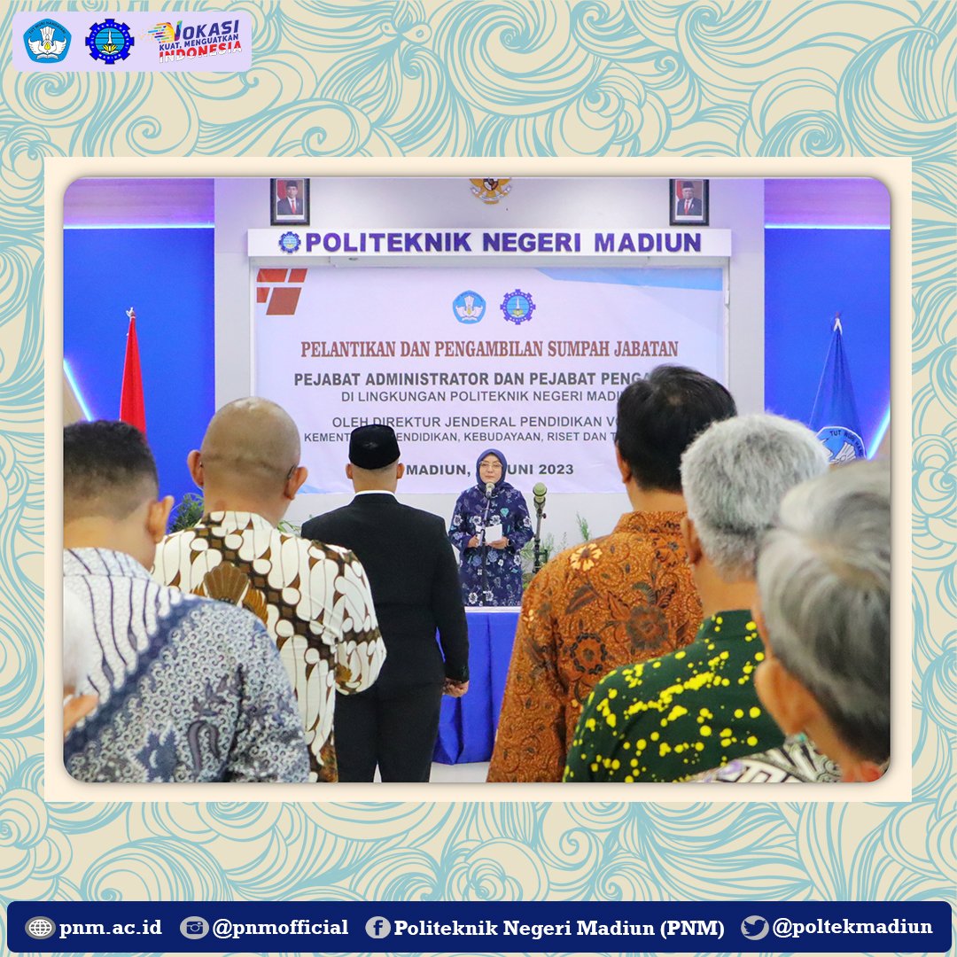 Direktur Jenderal Pendidikan Vokasi (Dirjen Diksi)Dr. Ir. Kiki Yuliati M.Sc melantik Pejabat Administrator dan Pejabat Pengawas di Politeknik Negeri Madiun (PNM) pada Selasa (20/06) di Gedung C Kampus 2 PNM. Selain Dirjen Diksi, acara pelantikan tersebut juga dihadiri oleh Direktur Akademik Pendidikan Tinggi Vokasi Dr. Beny Bandanadjaja, S.T., M.T., Direktur PNM Muhamad Fajar Subkhan, S.T., M.T., serta segenap pimpinan dan tamu undangan di lingkungan PNM.