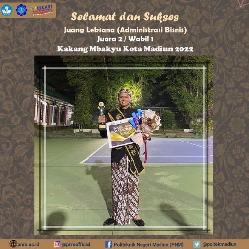 Duta Kampus Politeknik Negeri Madiun (PNM) 2022 terpilih menjadi Juara 2 atau Wakil 1 pada ajang Kakang Mbakyu Kota Madiun tahun 2022. Juang Leksana, mahasiswa Program Studi Administrasi Bisnis PNM membawa pulang gelar Juara 2 tersebut pada Selasa (20/12) malam.