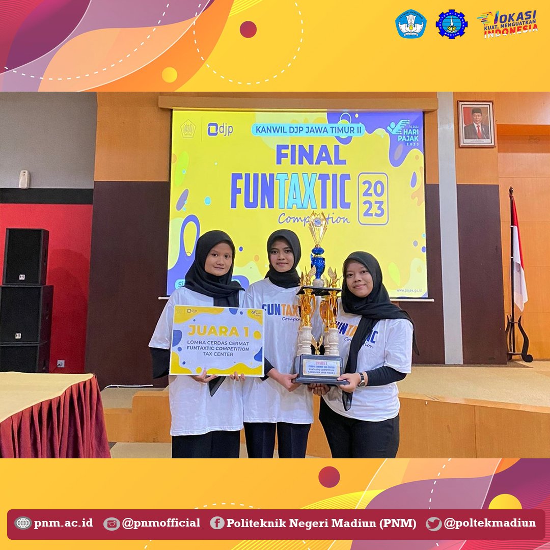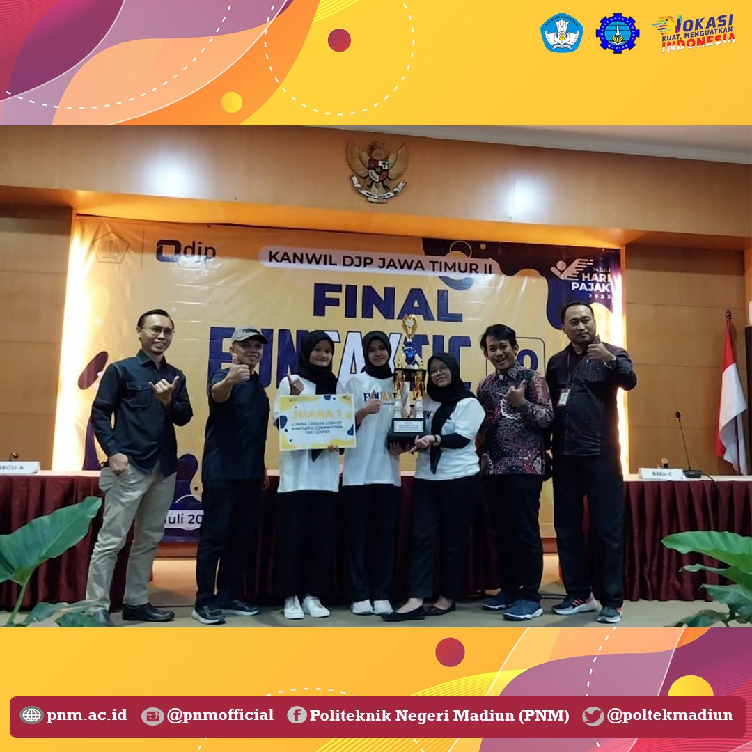 Tim Tax Center Politeknik Negeri Madiun (PNM) berhasil menyabet Juara 1 Lomba Cerdas Cermat Funtaxtic Competition yang diadakan oleh Kanwil DJP Jawa Timur II pada Kamis (13/07). Final perlombaan yang digelar secara luring tersebut bertempat di Aula Majapahit Kanwil DJP Jawa Timur II, Sidoarjo.