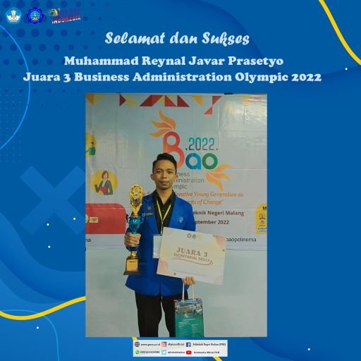 Madiun – Mahasiswa Program Studi Administrasi Bisnis Politeknik Negeri Madiun (PNM) Muhammad Reynal Javar Prasetyo meraih Juara 3 dalam Business Administration Olympic 2022. Bertempat di Gedung AB Politeknik Negeri Malang (Polinema), Reynal meraih kemenangan lewat kategori lomba Secretarial Skill.
