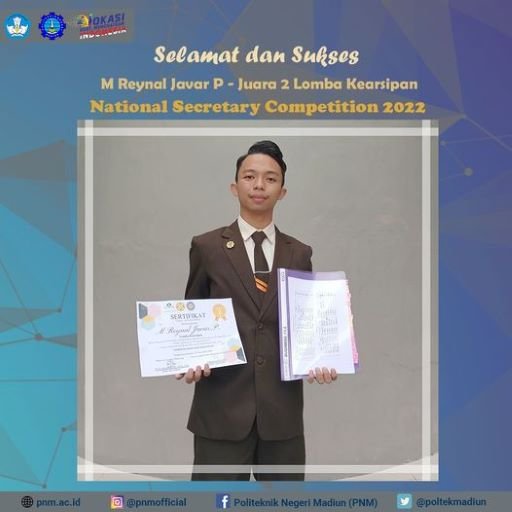 Madiun – Mahasiswa Prodi Administrasi Bisnis Politeknik Negeri Madiun (PNM) berhasil menyabet Juara 2 dalam National Secretary Competition 2022 yang diadakan oleh Prodi Sekretari D-III dan HIMA Fakultas Ekonomi dan Bisnis Universitas Pamulang. Ialah M Reynal Javar P yang berhasil memperoleh Juara 2 dalam kategori Lomba Kearsipan atau Video Cara Mengarsip (Abjad).