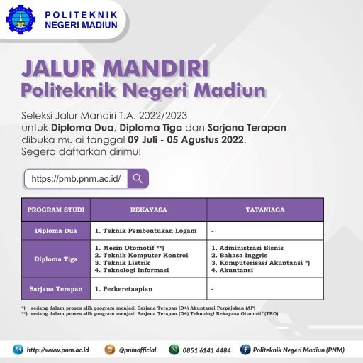 Politeknik Negeri Madiun akan membuka Pendaftaran Jalur Mandiri D2, D3 dan Sarjana Terapan Tahun Akademik 2022/2023