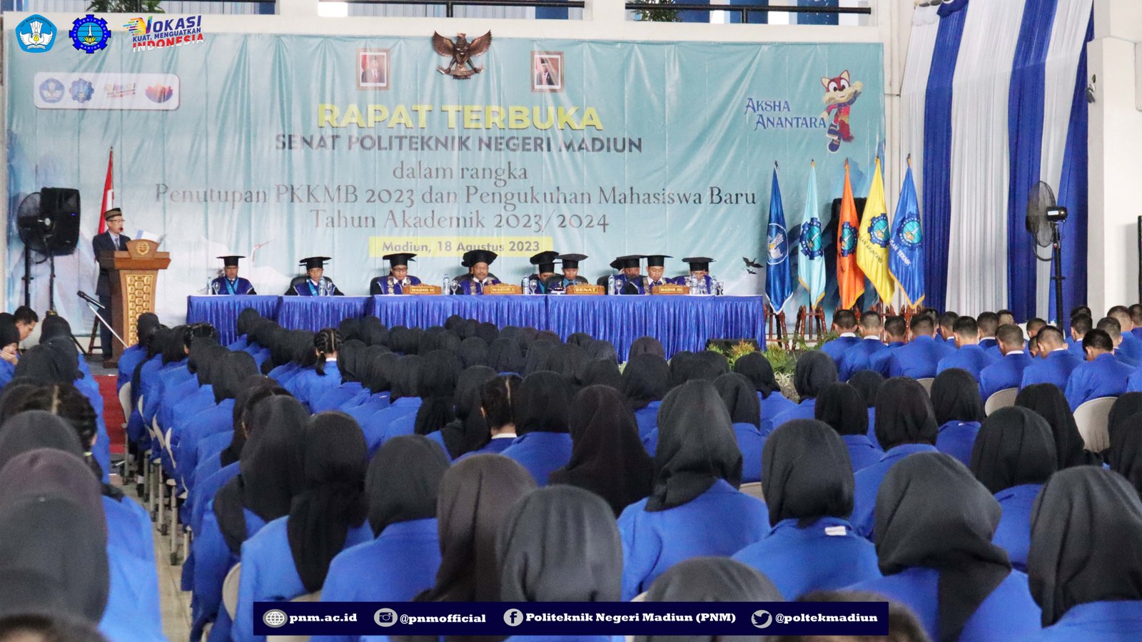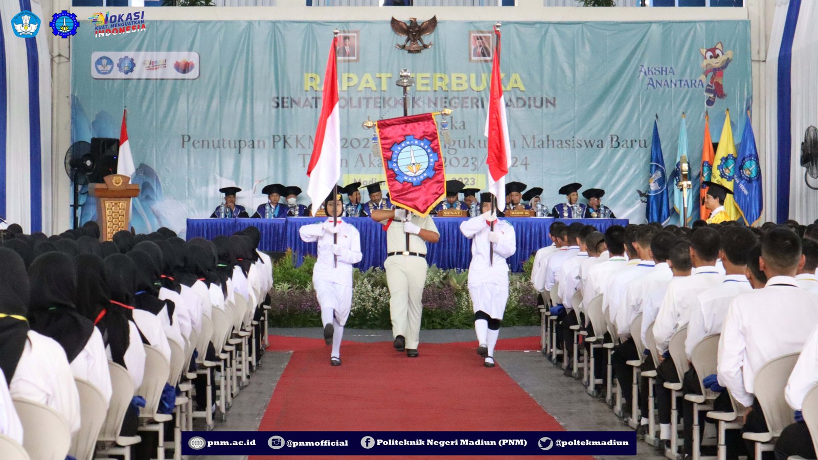 PNM – Rapat terbuka Senat Politeknik Negeri Madiun (PNM) dalam rangka Penutupan Pengenalan Kehidupan Kampus Bagi Mahasiswa Baru (PKKMB) 2023 dan Pengukuhan Mahasiswa Baru Tahun Akademik 2023/2024 telah dilaksanakan pada Jumat (18/08/2023). Kegiatan yang berlangsung di hall Kampus 1 PNM itu diikuti oleh sekitar 250 perwakilan mahasiswa baru.