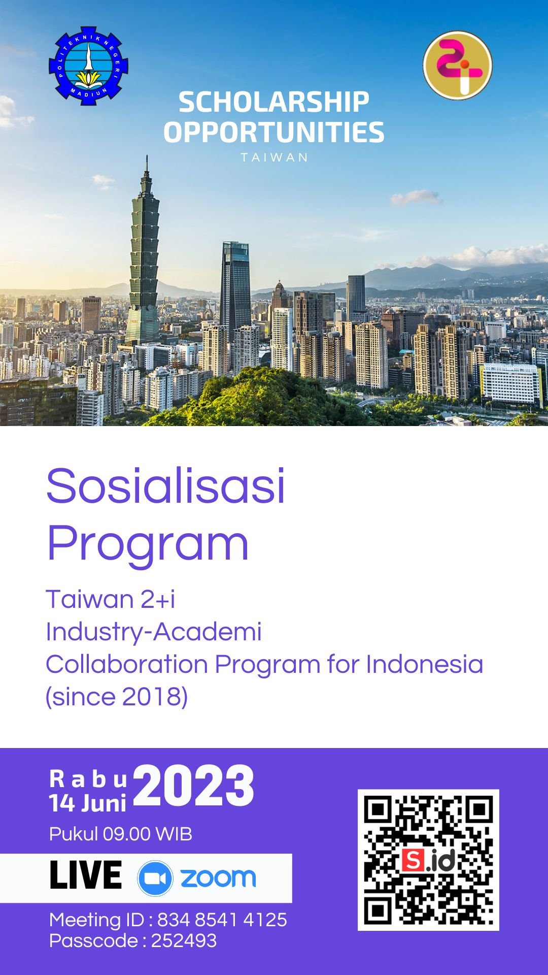 Politeknik Negeri Madiun menyelenggarakan kegiatan Sosialisasi Program Taiwan 2+i Industry-Academi Collaboration Program for Indonesia. Program antara Ministry of Education Taiwan dengan Kemendikbudristek terkait peluang mendapatkan beasiswa di Taiwan ini akan diselenggarakan pada: