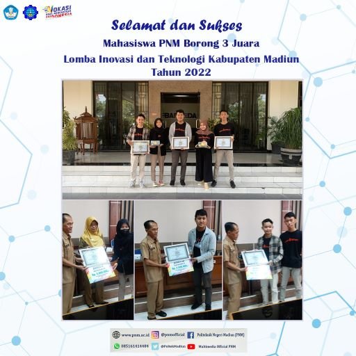 Madiun – Kamis (21/7), lima mahasiswa Politeknik Negeri Madiun (PNM) memborong tiga juara di ajang Inovasi dan Teknologi (Inotek) Kabupaten Madiun tahun 2022. Perlombaan yang digelar pada bulan Maret-Juni 2022 tersebut diselenggarakan di Ruang Rapat Utama Bappeda Kabupaten Madiun. Sedangkan pengumuman pemenang dan penyerahan hadiah lomba berlangsung di tempat yang sama pada Selasa (19/7).