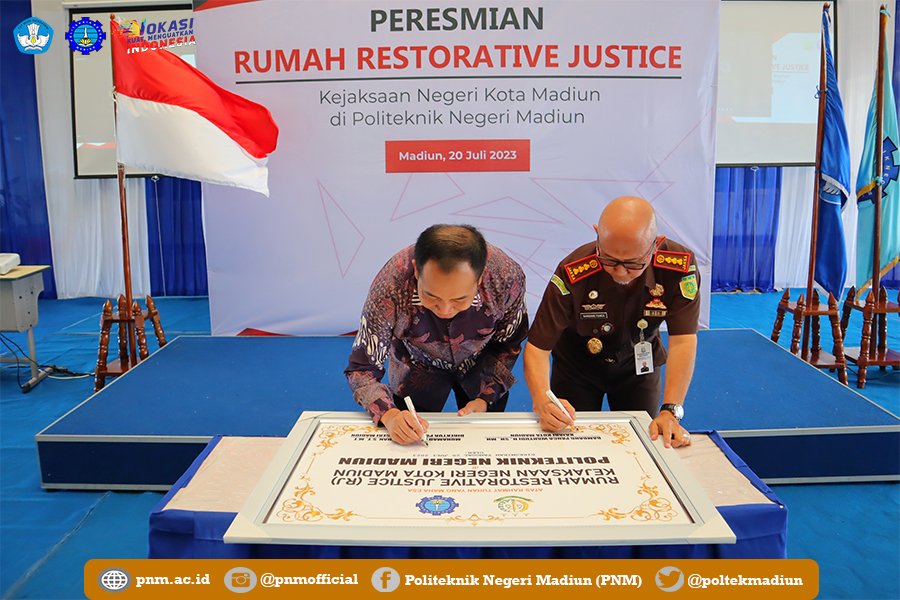 Politeknik Negeri Madiun (PNM) berkolaborasi dengan Kejaksaan Negeri (Kejari) Kota Madiun meresmikan Rumah Restorative Justice (RJ) di Kampus 2 PNM, Jalan Ring Road Barat, pada Kamis (20/07). Rumah RJ yang terletak di Gedung Administrasi Bisnis PNM tersebut diresmikan oleh Kepala Kejari Kota Madiun Bambang Panca Wahyudi Hariadi, S.H., M.H. bersama dengan Direktur Politeknik Negeri Madiun Muhamad Fajar Subkhan, S.T., M.T.