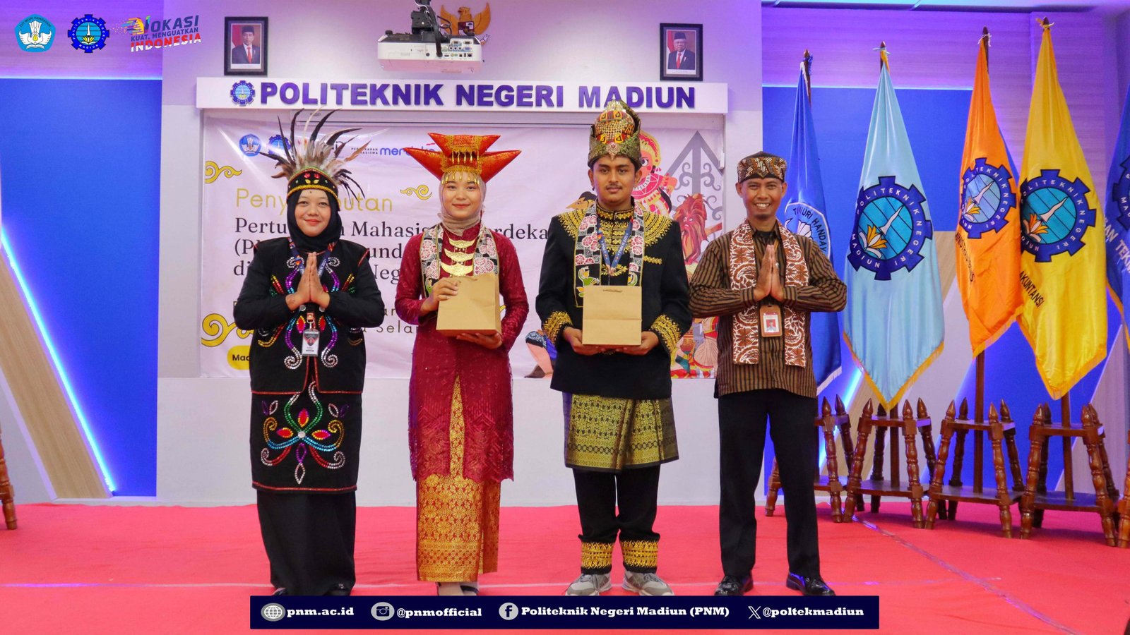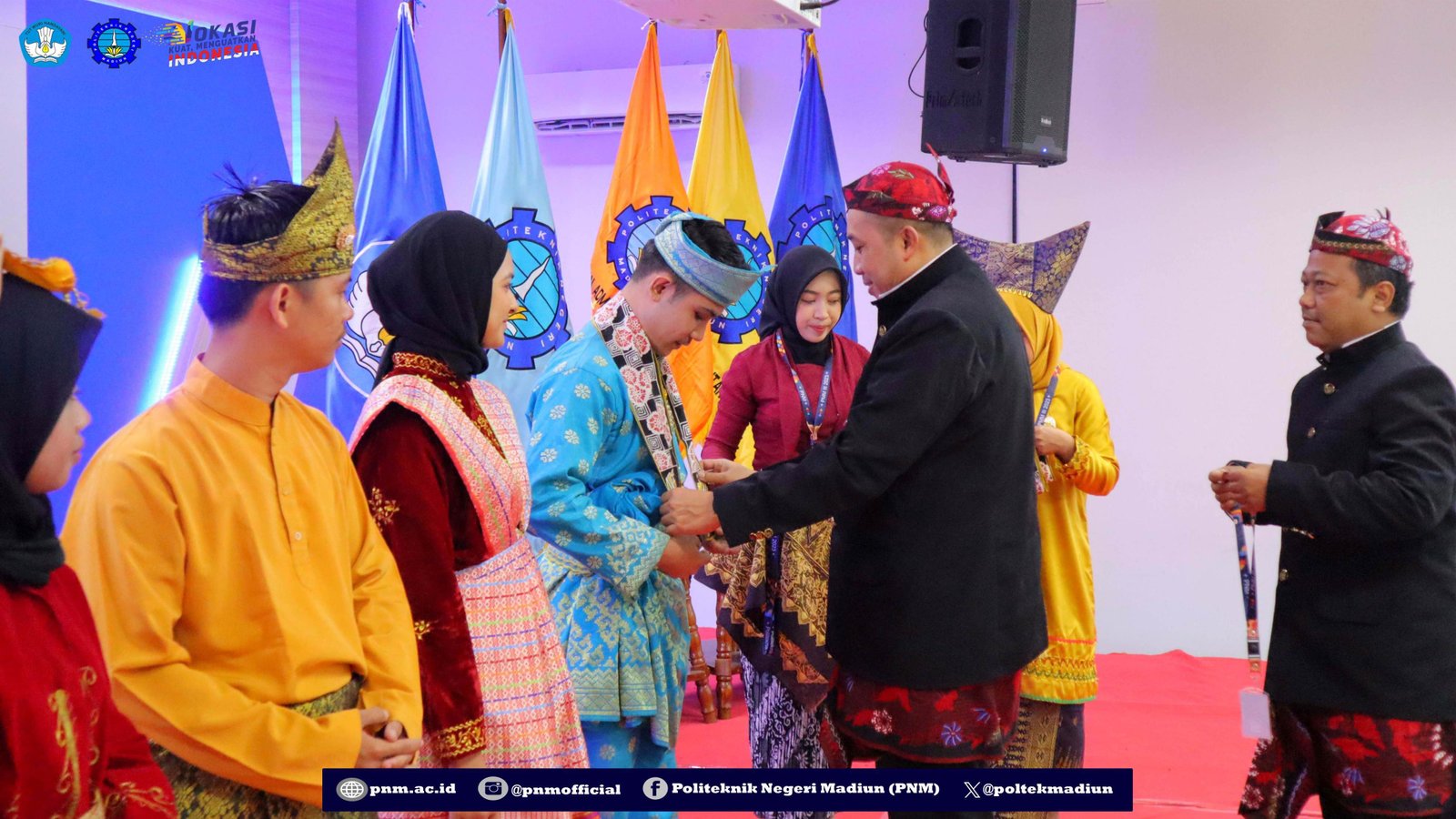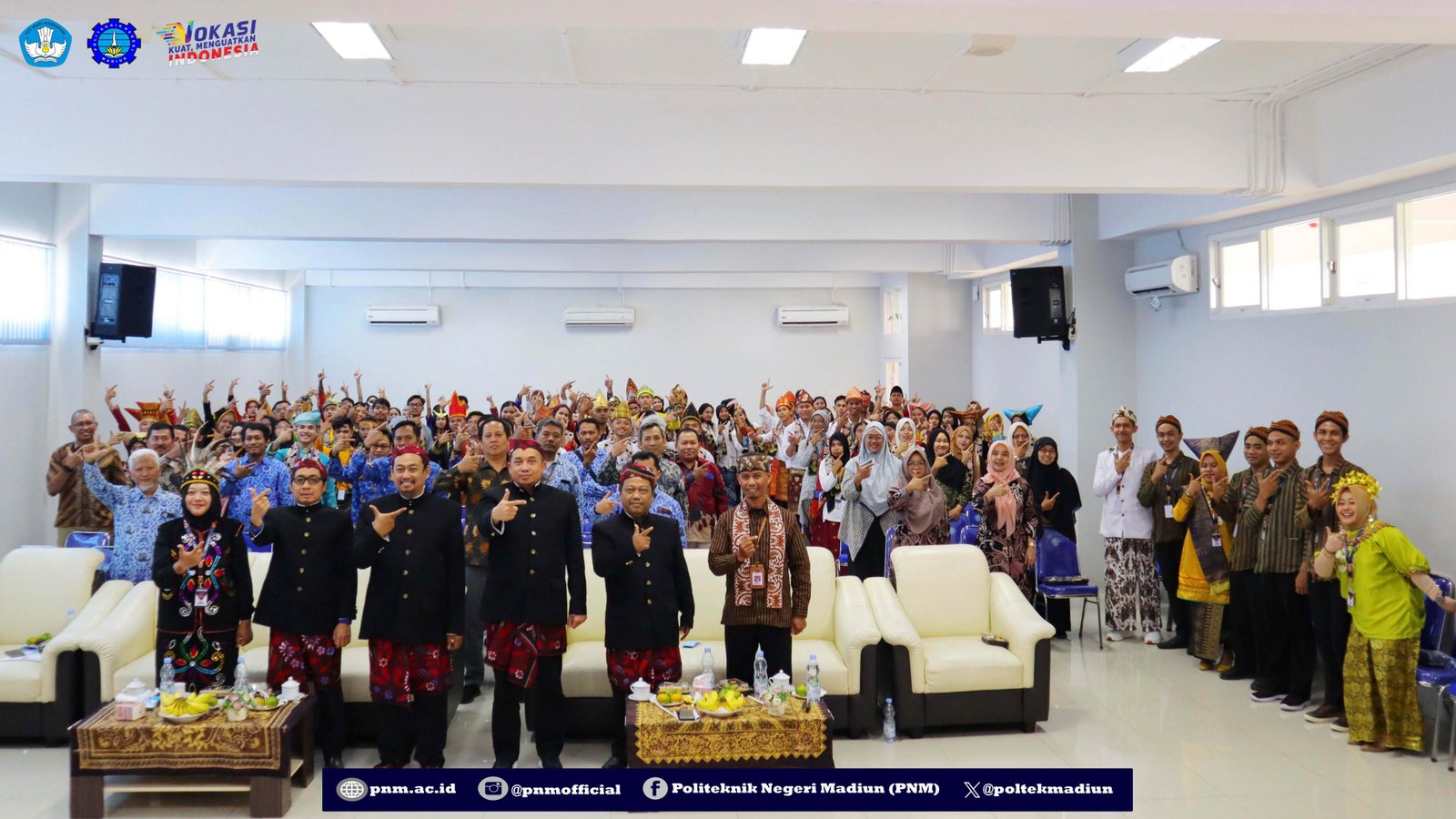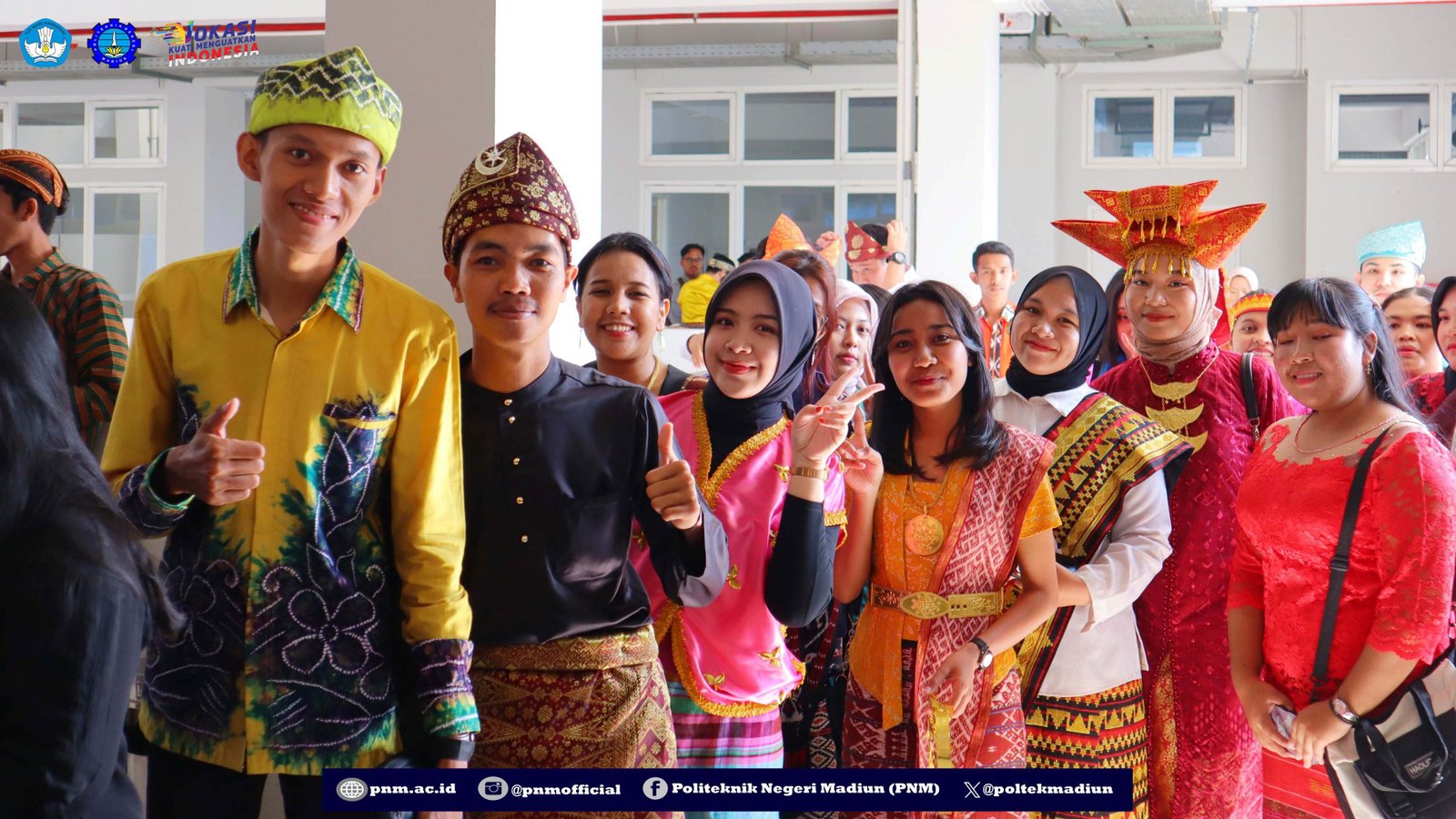“Saya merasa hari ini betul-betul menerima mahasiswa dari seluruh wilayah Indonesia karena semua berpakaian adat sesuai dengan daerah masing-masing. Terima kasih dan tepuk tangan untuk kita semua.” Sapa Direktur PNM Muhamad Fajar Subkhan, S.T., M.T. yang bersama jajaran wakil direktur mengenakan Beskap, pakaian adat Jawa Timur saat memberikan sambutan.