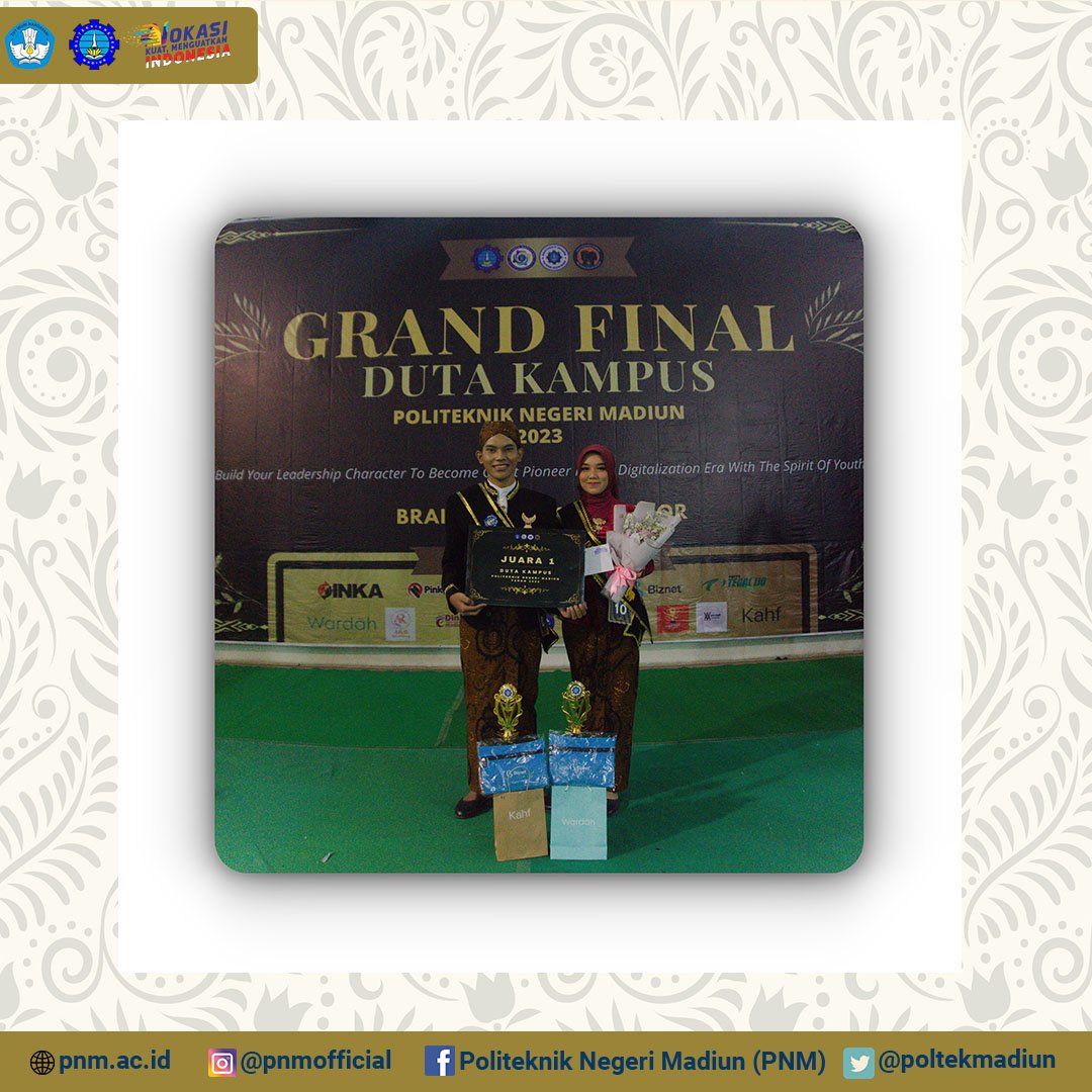 Mahasiswa Politeknik Negeri Madiun (PNM) perwakilan Program Studi (Prodi) Bahasa Inggris dan Administrasi Bisnis terpilih menjadi Duta Kampus PNM tahun 2023 pada Sabtu (27/05). Keduanya yakni Anfical Lower Silalahi (Prodi Bahasa Inggris) dan Mei Kharisma (Prodi Administrasi Bisnis). Grand final Duta Kampus 2023 yang berlangsung di Hall Kampus 1 PNM tersebut diikuti oleh 20 peserta terpilih.