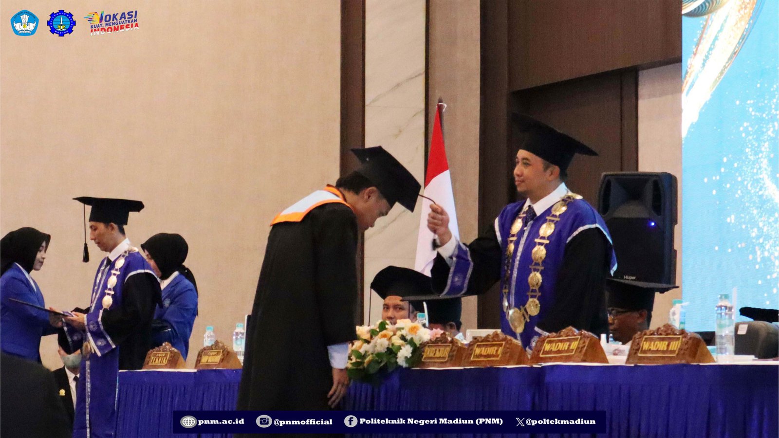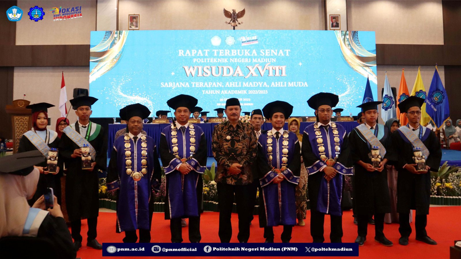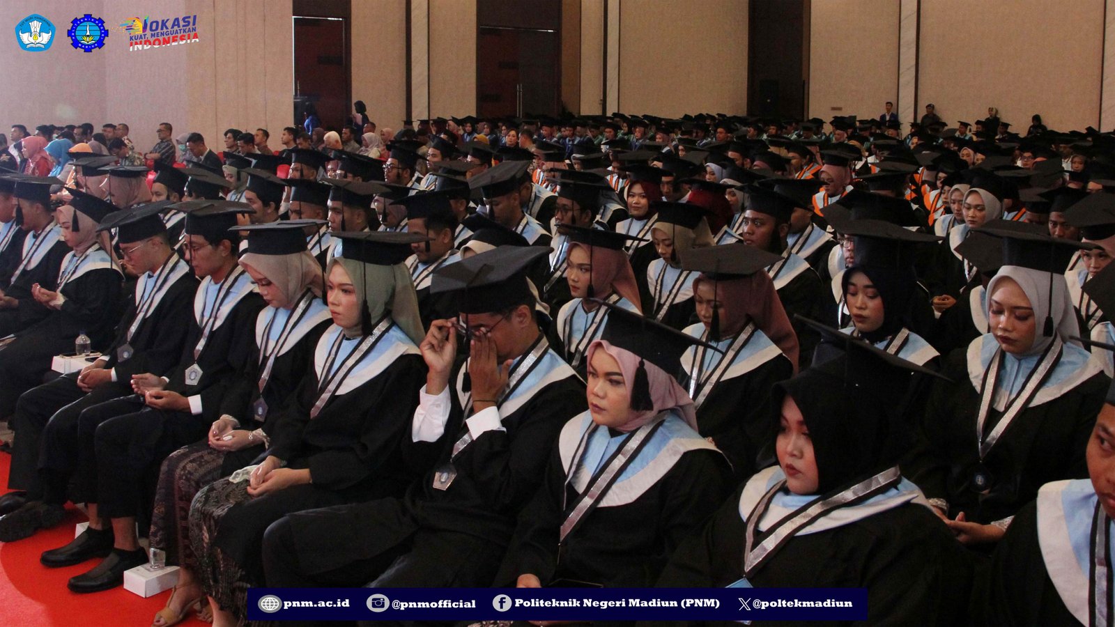 PNM – Politeknik Negeri Madiun (PNM) menggelar Wisuda XVIII Sarjana Terapan, Ahli Madya, Ahli Muda Tahun Akademik 2022/2023 pada Sabtu (30/09/2023). Bertempat di Ballroom The Sun Hotel Madiun, tahun ini PNM mewisuda sejumlah 560 wisudawan dari delapan program studi (prodi). Selain orang tua wisudawan dan sivitas akademika PNM, wisuda tahun ini juga dihadiri oleh Wali Kota Madiun, Forum Koordinasi Pimpinan Daerah (Forkopimda), serta segenap tamu undangan.