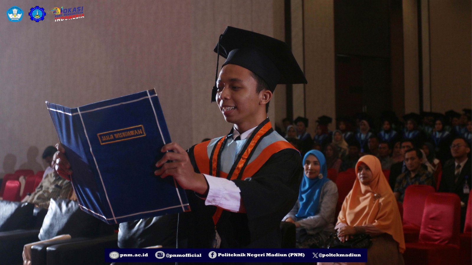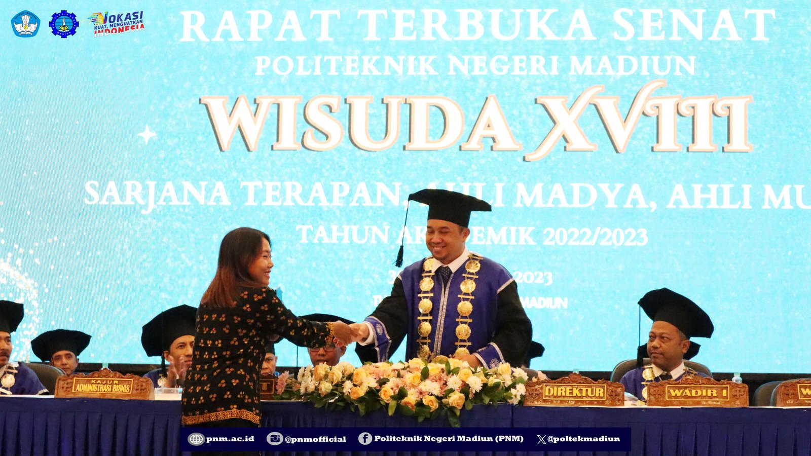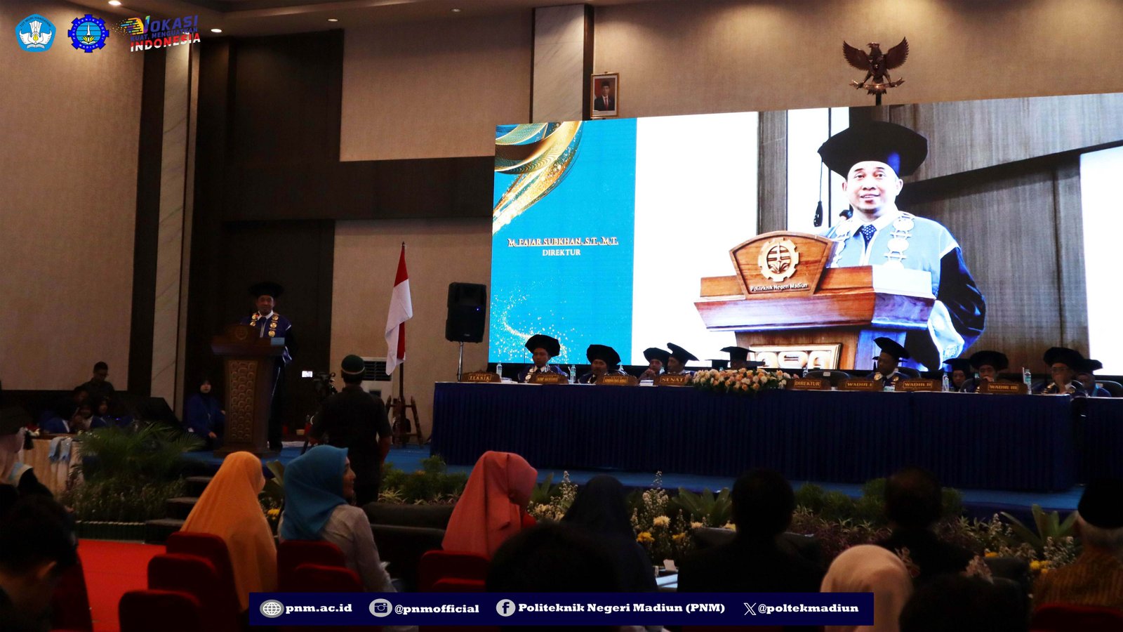 PNM – Politeknik Negeri Madiun (PNM) menggelar Wisuda XVIII Sarjana Terapan, Ahli Madya, Ahli Muda Tahun Akademik 2022/2023 pada Sabtu (30/09/2023). Bertempat di Ballroom The Sun Hotel Madiun, tahun ini PNM mewisuda sejumlah 560 wisudawan dari delapan program studi (prodi). Selain orang tua wisudawan dan sivitas akademika PNM, wisuda tahun ini juga dihadiri oleh Wali Kota Madiun, Forum Koordinasi Pimpinan Daerah (Forkopimda), serta segenap tamu undangan.