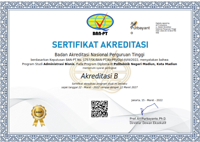 Program studi Diploma III (Ahli Madya) Administrasi Bisnis adalah salah satu program studi di Politeknik Negeri Madiun. Masa studi pada program Diploma III Administrasi Bisnis adalah tiga tahun atau enam semester, dengan rincian lima semester kuliah di kampus termasuk penyelesaian laporan akhir studi dan satu semester digunakan untuk Praktek Kerja Lapangan (PKL)/internship. Perkuliahan di D3 Administrasi Bisnis memiliki komposisi jumlah jam perkuliahan sekitar 40% teori dan 60% praktek. Lulusan program studi D3 Administrasi Bisnis dicetak dapat memiliki keahlian di bidang administrasi dalam lingkup kantor dan administrasi bisnis. Keahlian dan keterampilan khusus yang dimiliki oleh lulusan program studi D3 Administrasi Bisnis diantaranya adalah Office Administrative, Administration Assistant/Personal Assistant, Bank Front Liner (Customer Service, Teller), Supervisor, Customer Care, Public Relations Officer, Entrepreneur. Program D3 Administrasi Bisnis memiliki 1 (Satu) mini bank dan 4 (empat) Laboratorium, yaitu laboratorium arsip, laboratorium bahasa, laboratorium pengetikan, dan laboratorium komputer.