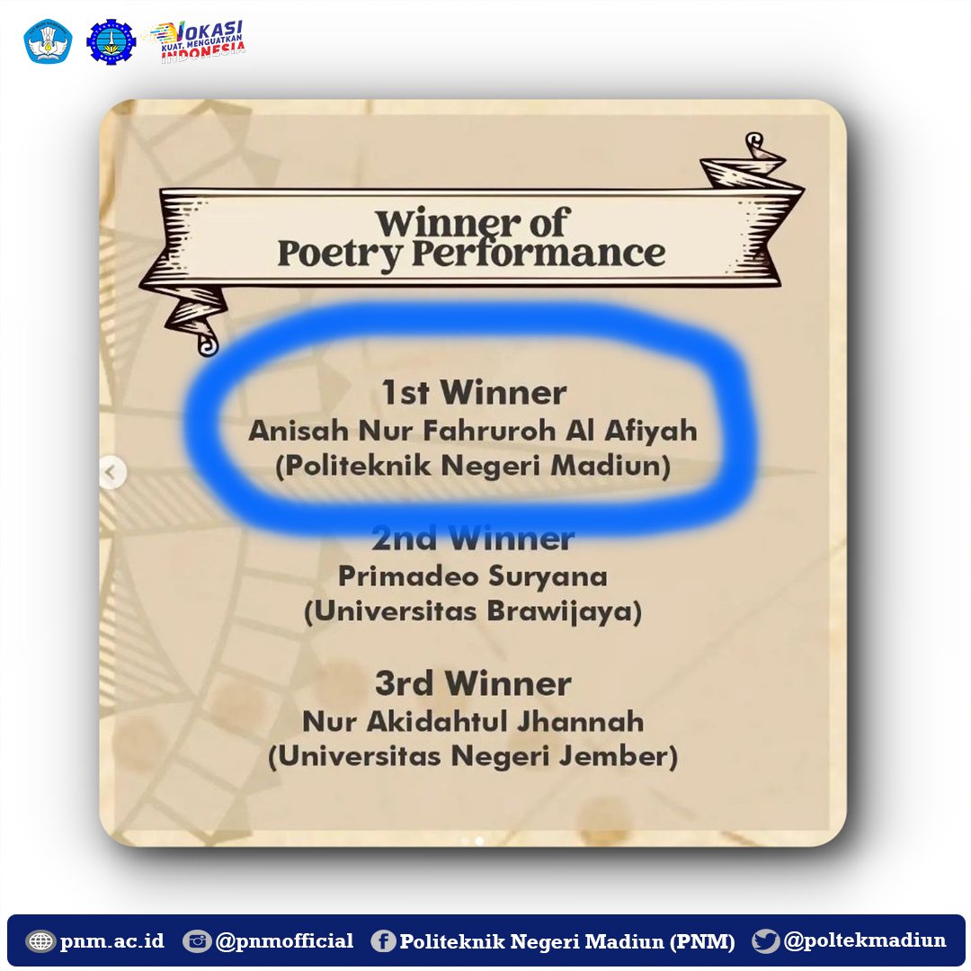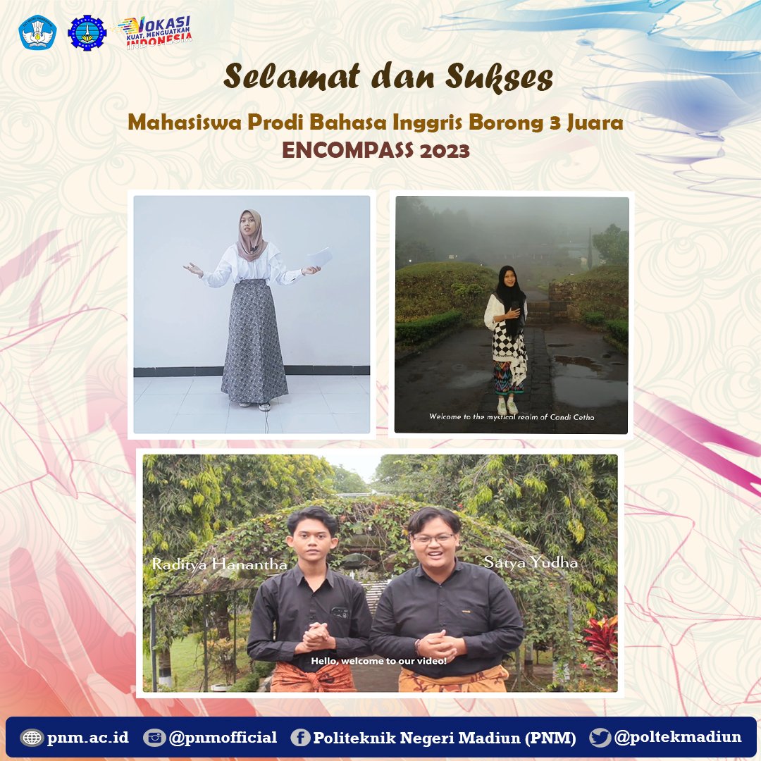 Madiun State Polytechnic (PNM) English Language Study Program (Prodi) students successfully won three championsEnglish National Competition of Performance, Art, and Social Speaking(ENCOMPASS) in 2023. The announcement was made via the Instagram account @encompassub_2023 on Sunday (25/06).