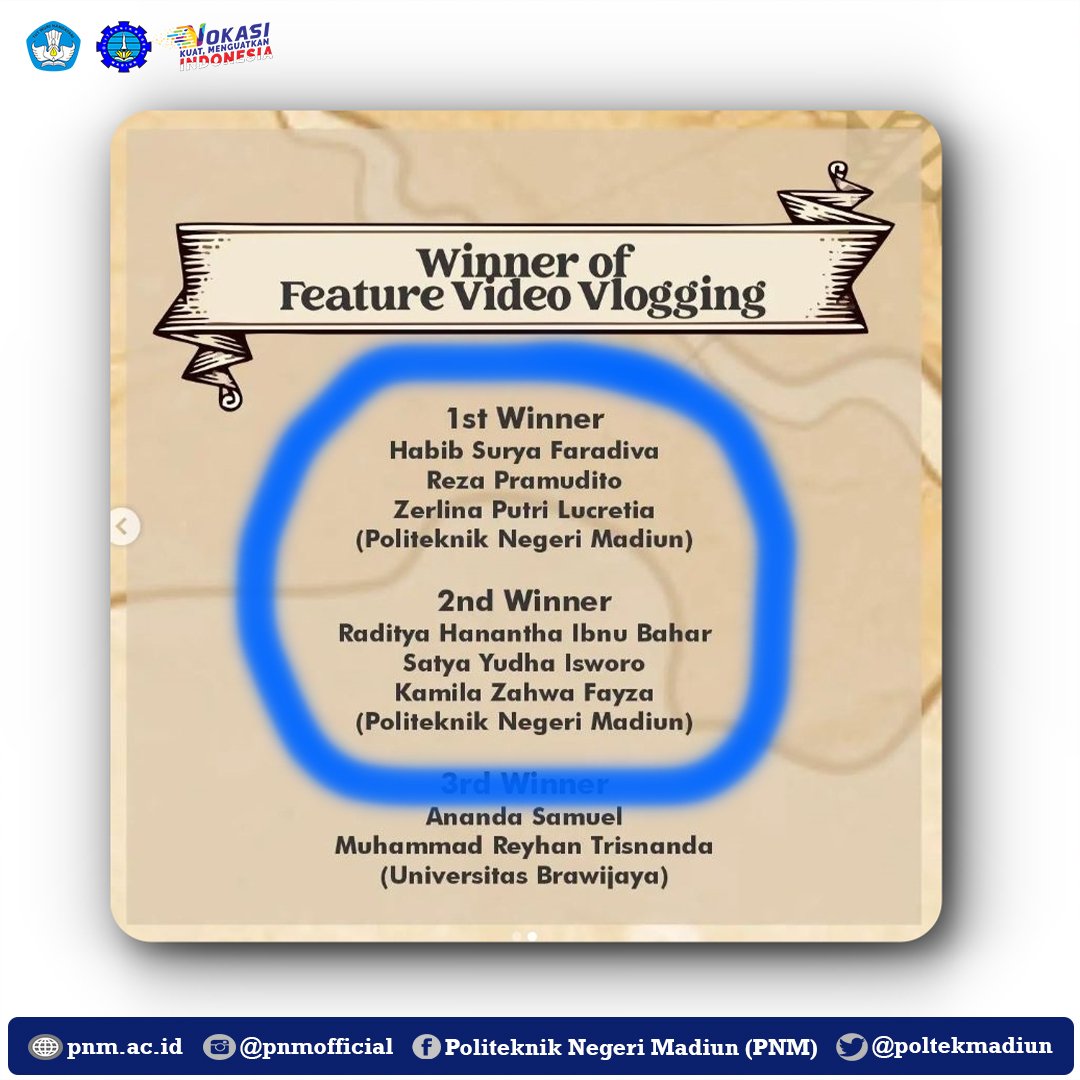 - Champion number 1 Feature Video Vlogging: Describing Indonesia (team): Habib Surya Faradiva, Reza Pramudito, Zerlina Putri Lucretia.