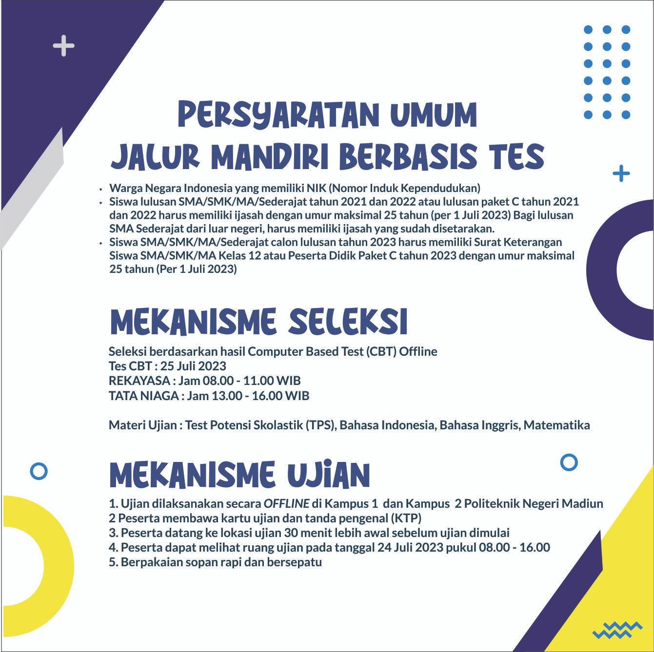 Madiun State Polytechnic's Test-Based Independent Pathway for Batch 2 is similar to the SNBT Registration Pathway which is held nationally.