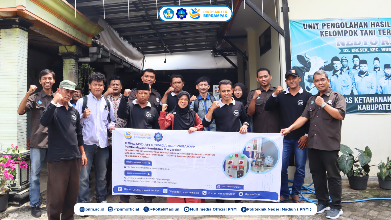 pnm.ac.id – Tim Pengabdian Kepada Masyarakat (PKM) BIMA Politeknik Negeri Madiun (PNM) kembali menunjukkan komitmen dalam mendukung peternak lokal. Melalui PKM skema Pemberdayaan Berbasis Masyarakat tahun 2025, Tim PKM BIMA menginisiasi program bertajuk “Penguatan Kelompok Tani Ternak Sapi Perah Nedyo Rahayu Madiun Melalui Inovasi Pasteurisasi Otomatis dan Integrasi Sistem Pemesanan Digital”.